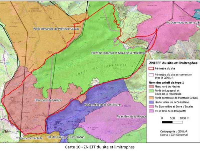 Les deux tiers orientaux du site sont entièrement inclus dans la ZNIEFF continentale de type 1 « Forêt de Lapazeuil et Soula de la Moulinasse » (CARTE 10). Cette ZNIEFF de 1 200 ha a été désignée du fait de la présence d’espèces patrimoniales, principalement forestières, montagnardes ou liées aux zones humides. Il s’agit essentiellement de plantes mais également du Desman des Pyrénées ou du Grand Tétras.